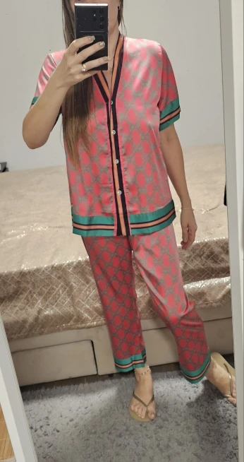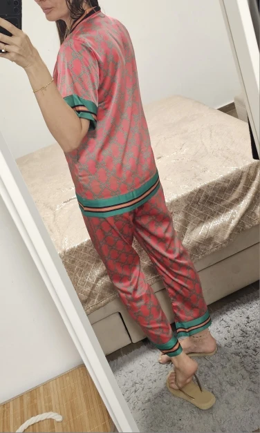 Smooth and lightweight, this pyjama set in ice silk offers a cool, breathable feel with a touch of elegance. The red base is accented by a chic chain-print design and contrast striped cuffs, giving it a refined yet modern look. The long-sleeve lapel-collar top pairs with matching trousers for effortless comfort day or night.