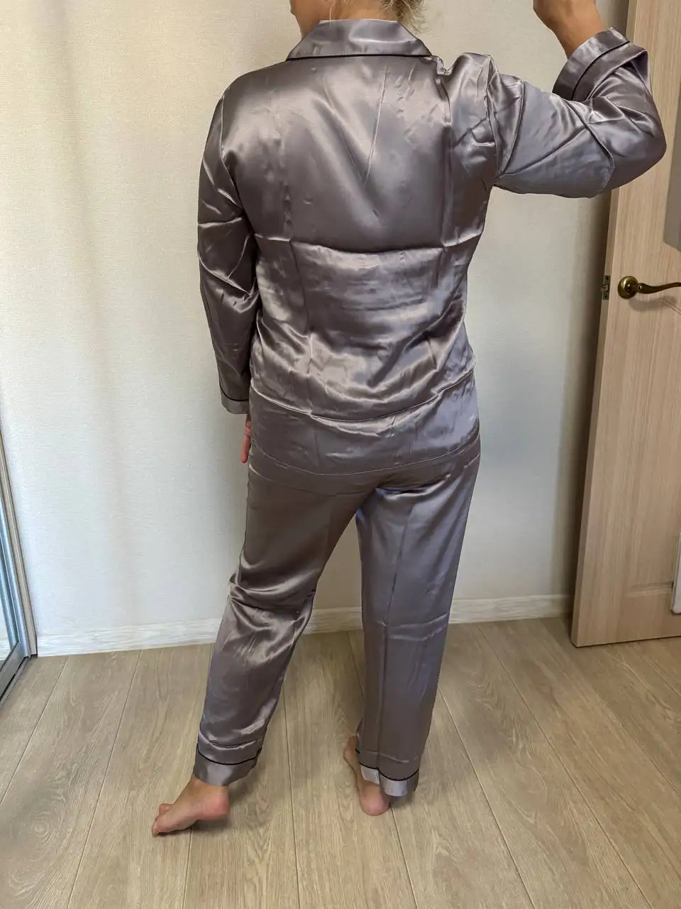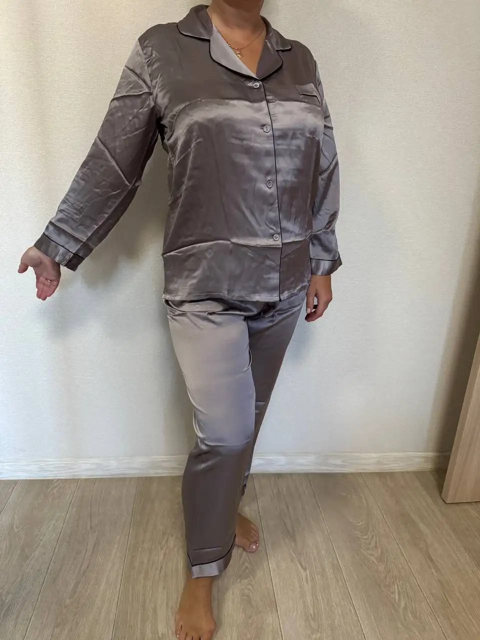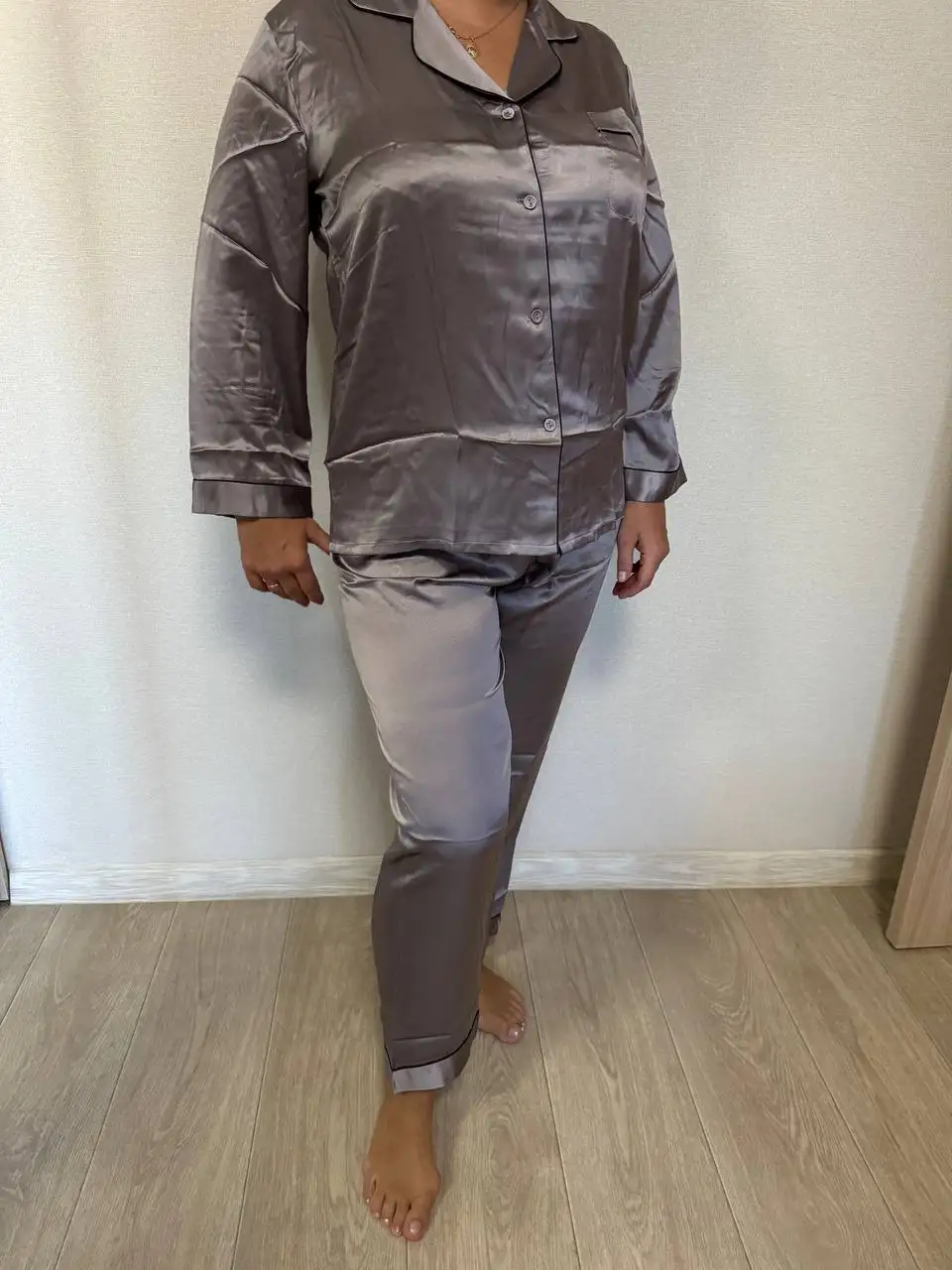 Indulge in timeless elegance with this long pyjama set crafted from pure mulberry silk. With a naturally smooth and lustrous finish, it offers exceptional softness against the skin and year-round comfort. The button-front lapel-collar top pairs with matching full-length trousers, complete with delicate piping for a refined touch. Available in multiple rich shades, it’s a luxurious essential for restful nights and elegant lounging.